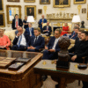 Na zdjęciu na pierwszym planie widać sławne biurko Resolute, ważące ponoć sześćset kilo, które królowa Wiktoria darowała swego czasu na znak przyjaźni prezydentowi R.B. Hayesowi, a po licznych późniejszych perypetiach Jimmy Carter sprowadził je na powrót do Białego Domu i postawił w Gabinecie Owalnym. Donald Trump uczynił z tego biurka, bardziej niźli ktokolwiek dotąd, główny atrybut władzy prezydenta USA, wykorzystując je – niczym święty rekwizyt – przy oświadczeniach publicznych i ceremoniach podpisywania aktów prawnych. Trump ukształtował pewien państwowy ceremoniał związany z biurkiem „Resolute”, polegający na tym, iż tylko on sam, jako wcielenie zbiorowego suwerena, zasiada w trakcie ceremonii za biurkiem, a wszyscy inni uczestnicy stoją po jego obu stronach. Regularnie możemy oglądać zatem czołowych amerykańskich polityków, którzy stojąc obok biurka, wygłaszają swoje oświadczenia. A w Polsce pamiętamy drakę, jaka u nas powstała, gdy prezydent Andrzej Duda, stojąc obok biurka „Resolute”, podpisywał jakąś wspólną deklarację z zasiadającym za „świętym” biurkiem prezydentem USA.