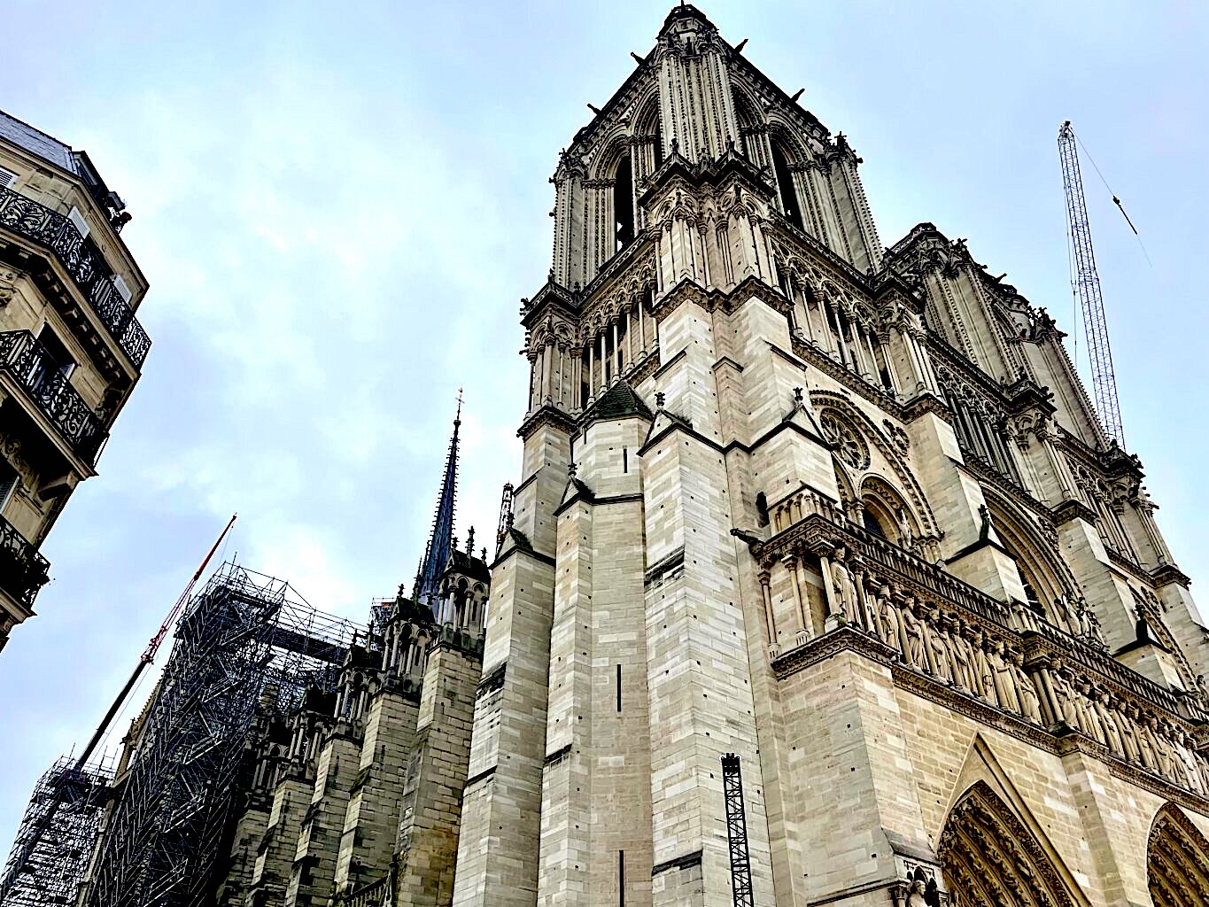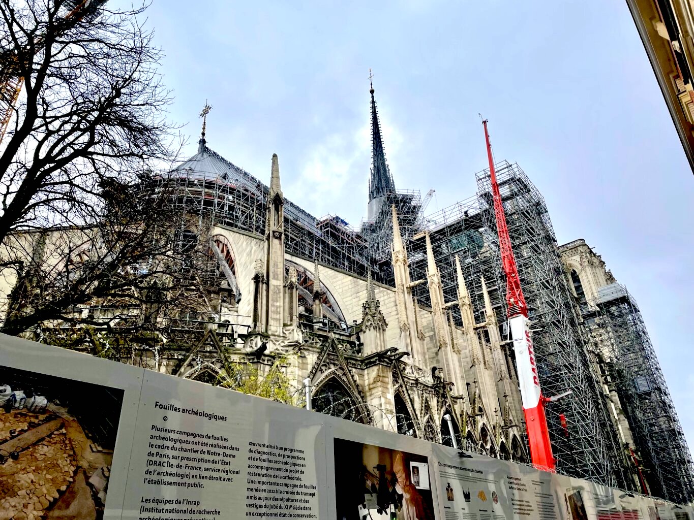 Rusztowania rozmieszczone są wokół całej katedry z wyjątkiem fasady zachodniej (gdzie znajduje się również wejście do świątyni). Od strony rue de Cloitre Notre-Dame zasłaniają one część budowli, jednak zwiedzający mogą zobaczyć tam wystawę poświęconą odbudowie Notre-Dame i jej poszczególnych elementów (m.in. witraży czy organów). Odbudowywana katedra dobrze jest widoczna z drugiego brzegu Sekwany, z quai Montebello. Pomimo obecności dźwigów i rusztowań widać strukturę katedry, portal, rzeźby, witraże oraz odbudowany dach.