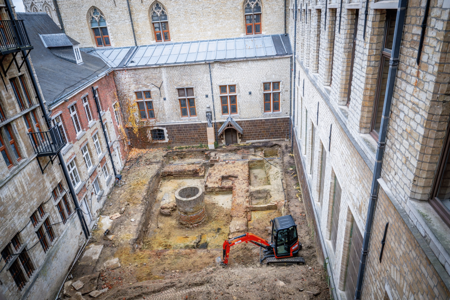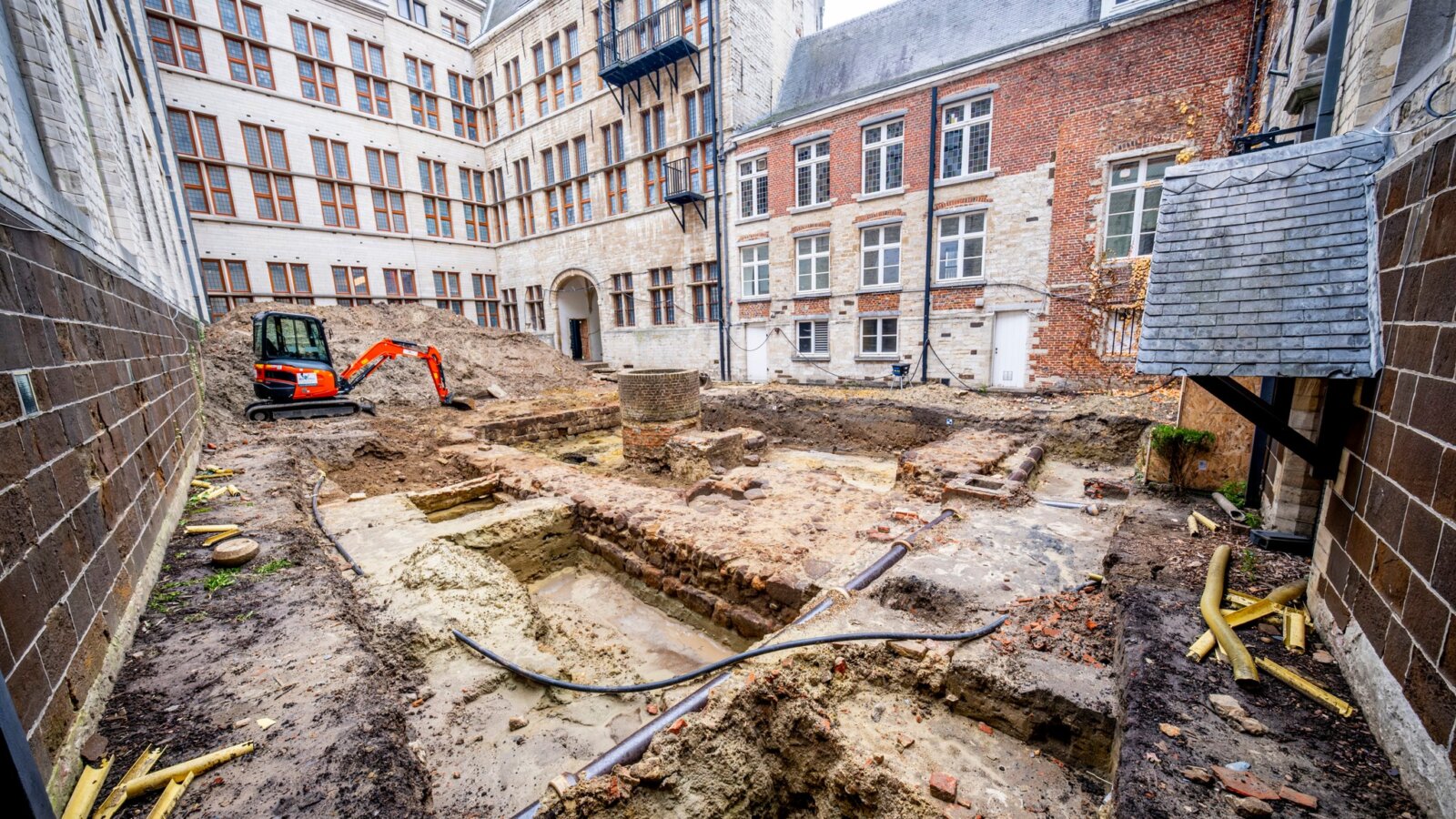 .Odkrycia dokonano w trakcie restauracji obiektu, na terenie wewnętrznego dziedzińca ratusza, znanego jako Vrijthof. Zachowane fragmenty obejmują masywne, metrowej grubości mury oraz schody, co – jak podkreślił miejski radny ds. zabytków Dirk Vansina z Chrześcijańskich Demokratów i Flamandów (CD&V) – wskazuje, że były to domy należące do zamożnych mieszkańców. W średniowieczu dominowało tam budownictwo drewniane, a kamienne konstrukcje były rzadkością. Zabudowania zostały rozebrane w XV wieku, by zrobić miejsce pod budowę obecnego ratusza.