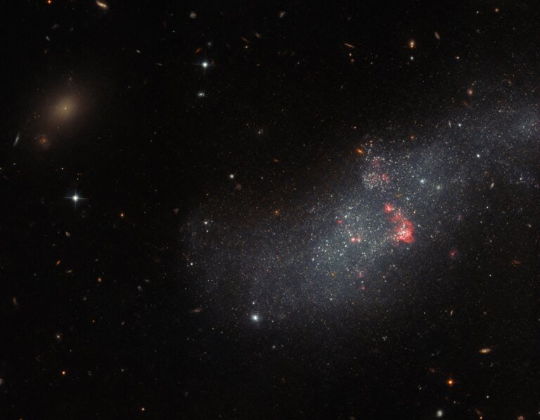 .Jak tłumacza badacze z NASA, zdjęcie z Kosmicznego Teleskopu Hubble’a, przedstawia galaktykę karłowatą znaną jako UGCA 307. Mały obiekt kosmiczny składa się z rozproszonego pasma gwiazd zawierającego czerwone bąbelki gazu, które oznaczają regiony niedawnego formowania się gwiazd. Galaktyka karłowata znajduje się około 26 milionów lat świetlnych od Układu Słonecznego, w gwiazdozbiorze Kruka. UGCA 307 jak opisują astronomowie jest mała i nie posiada wyraźnej struktury i przypomina jedynie mglistą plamę przypominającą chmurę unoszącą się w przestrzeni kosmicznej.