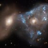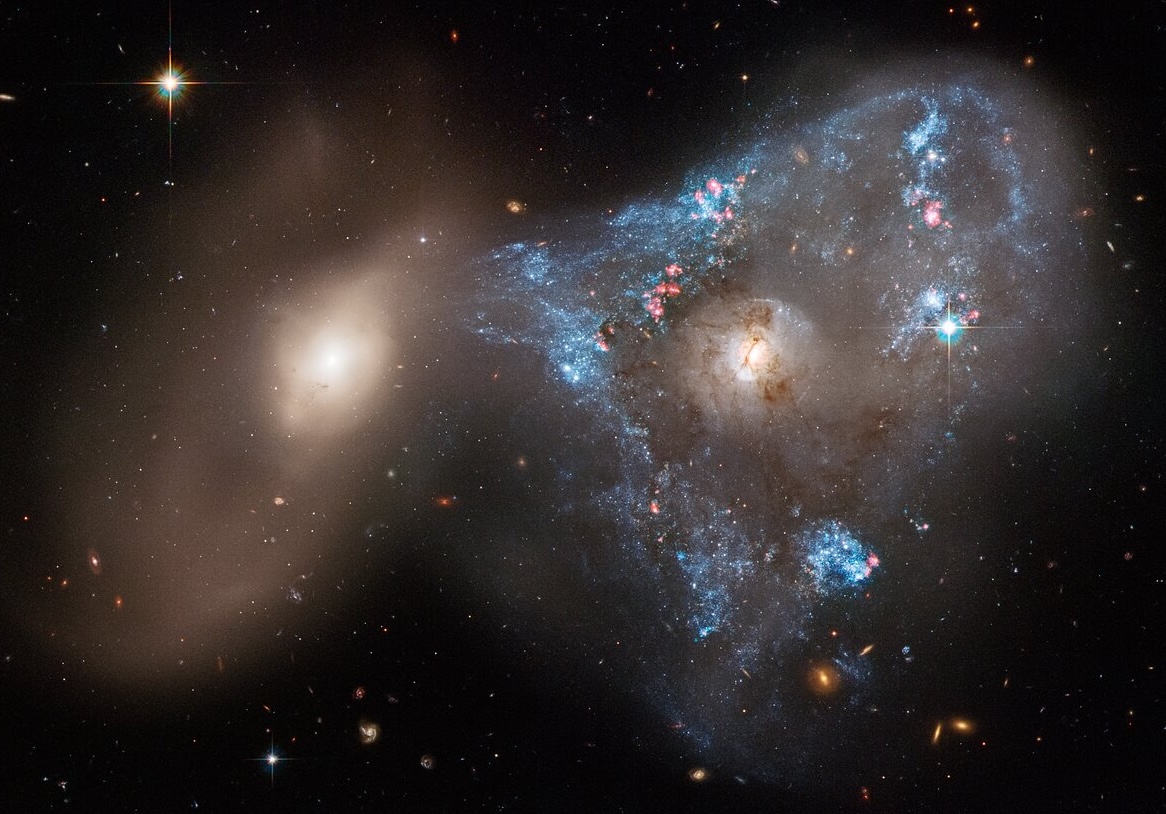 .Jak tłumaczą badacze z ESA, na obrazie z Kosmicznego Teleskopu Hubble’a widoczna jest pada zderzających się galaktyk znana jako Arp 143. Jest ona oddalona o około 191 milionów lat świetlnych od Układu Słonecznego i znajduje się w gwiazdozbiorze Rysia.