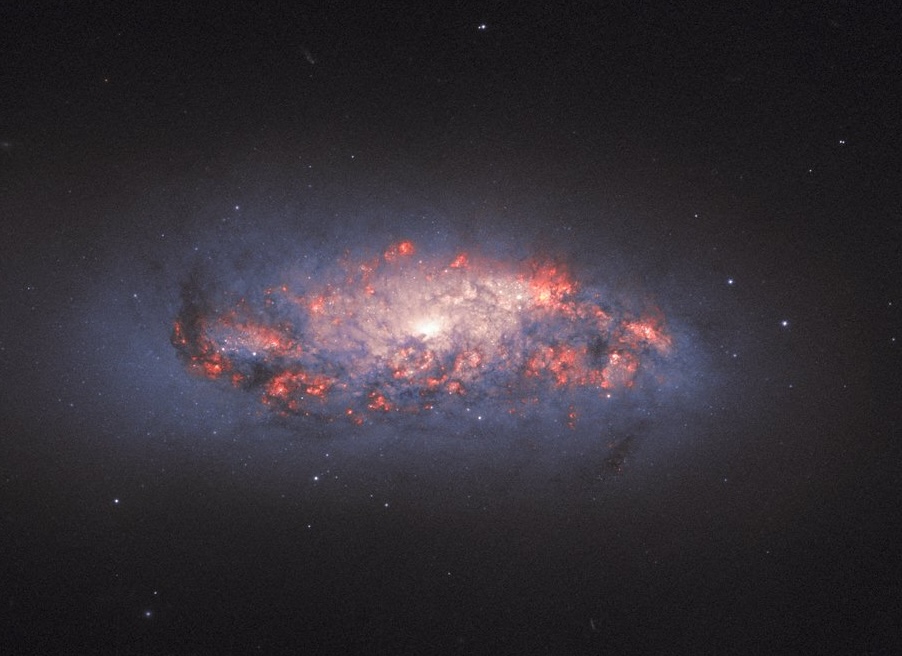 .Pomarańczowo-różowa poświata widoczna na zdjęciu NGC 972, zdaniem astronomów, powstaje, gdy gazowy wodór reaguje na intensywne światło pochodzące z pobliskich nowo narodzonych gwiazd – na obrazie te jasne plamy są obecne pośród ciemnych, splątanych kłębów kosmicznego pyłu.