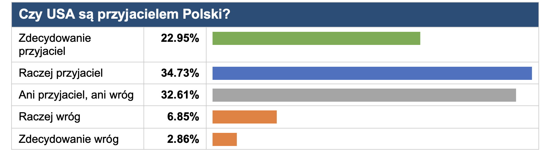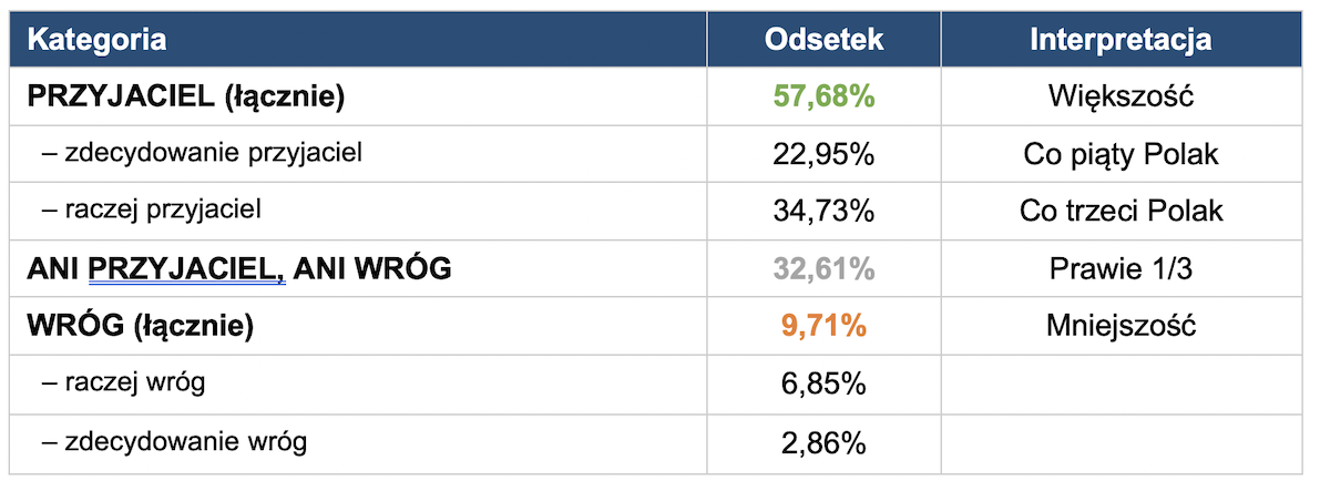 Ponad połowa Polaków (57,68%) uznaje USA za przyjaciela, co wskazuje na trwałość sojuszu transatlantyckiego w świadomości społecznej. Jednocześnie: