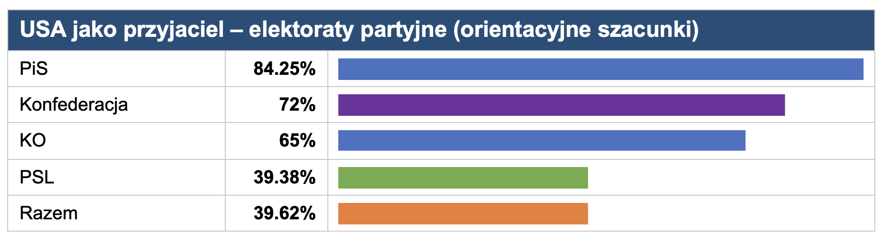 - Różnica między PiS (84,25%) a Razem (39,62%) w postrzeganiu USA jako przyjaciela wynosi niemal 45 punktów procentowych