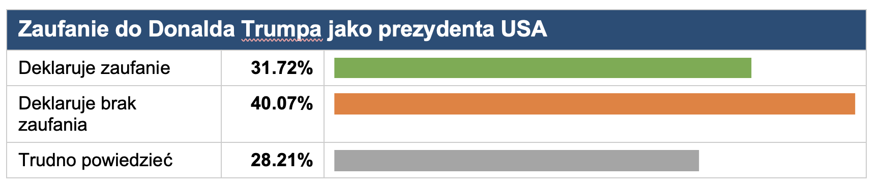 Ocena samego Donalda Trumpa jako polityka jest znacznie bardziej negatywna niż ogólny stosunek do USA. Przewaga braku zaufania nad zaufaniem wynosi niemal 10 punktów procentowych.