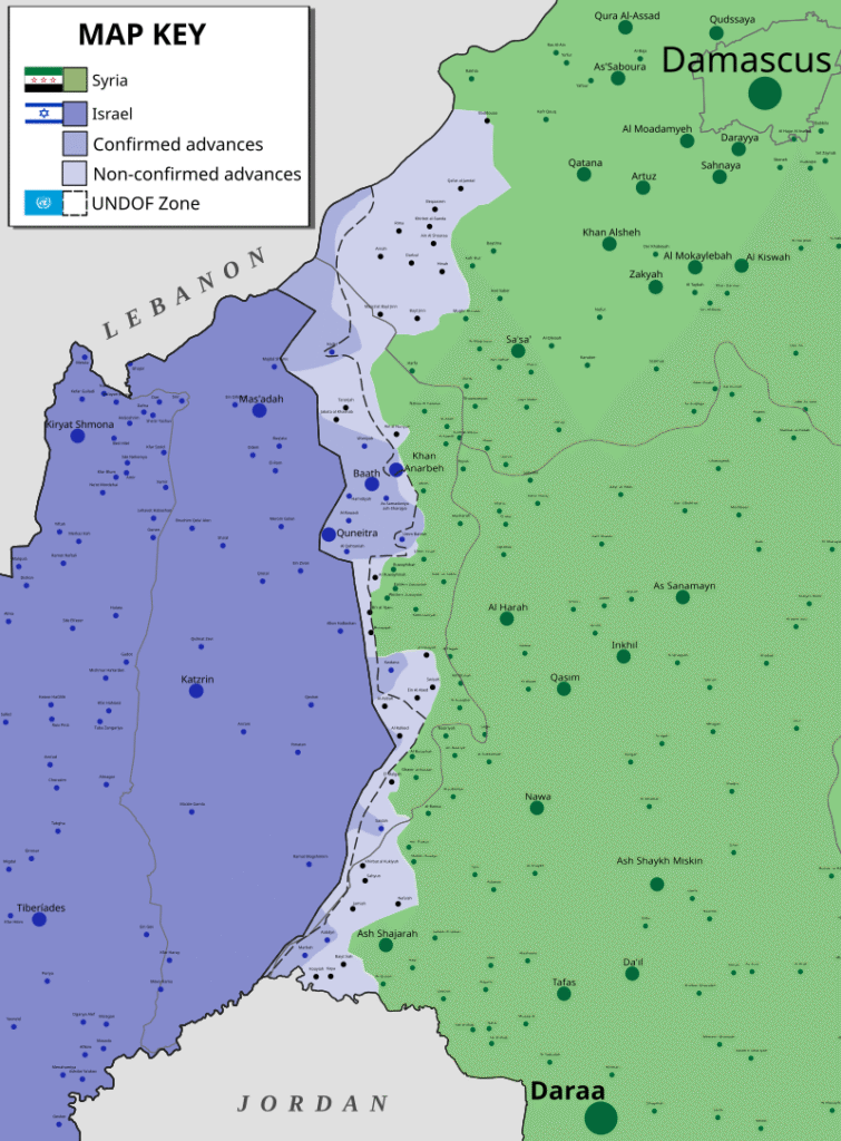 .Benjamin Netanjahu stwierdził, że Izrael ma „dwie nieprzekraczalne linie” w przypadku Syrii. Pierwsza – jak to ujął – to „demilitaryzacja na południe od Damaszku”. Chodzić ma o tereny od Wzgórz Golan na zachodzie po Góry Druzyjskie (Dżabal ad-Duruz) na wschodzie. Drugą jest natomiast ochrona społeczności druzyjskiej.