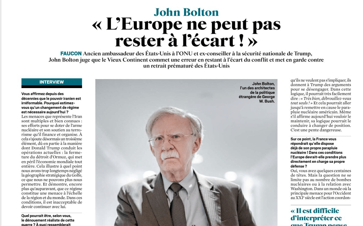 „Europa nie może pozwolić sobie na odwracanie wzroku. Jeśli chcecie silniejszej Rosji i Chin na Bliskim Wschodzie, możecie nadal udawać, że ta wojna was nie dotyczy” – przekonuje John Bolton, były ambasador USA przy ONZ i były doradca ds. bezpieczeństwa narodowego Donalda Trumpa, w wywiadzie dla francuskiego tygodnika „Journal du Dimanche” zatytułowanym: „Europa nie może pozostać z boku konfliktu na Bliskim Wschodzie”.