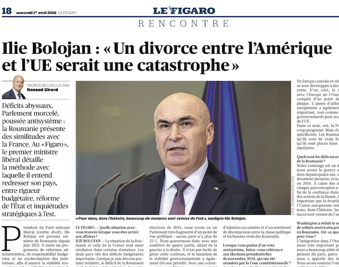 Premier Rumunii w rozmowie z „Le Figaro” tłumaczy, że Rumunia wspiera obecność baz sojuszniczych, w tym amerykańskich i francuskich; Rumuni rozumieją też oczekiwania Stanów Zjednoczonych wobec Europy w zakresie większego zaangażowania w obronność. „Dlatego zwiększyliśmy wydatki i współpracujemy z europejskim przemysłem zbrojeniowym” – podkreśla premier Bolojan.