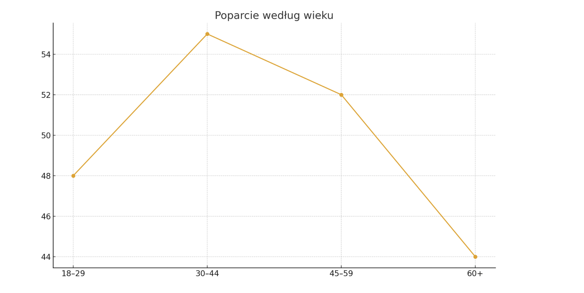 Wyniki z podziałem na grupy wiekowe wskazują, że największe poparcie występuje wśród osób w wieku 30–44 lata (55%), a najmniejsze w grupie 60+. Najsilniejsza grupa poparcia (30–44) charakteryzuje się zarówno doświadczeniem życiowym, jak i większą aktywnością zawodową i społeczną. Wynik może sugerować, że komunikacja Karola Nawrockiego trafia w potrzeby wyborców, którzy szukają zarówno stabilności, jak i modernizacyjnych rozwiązań.