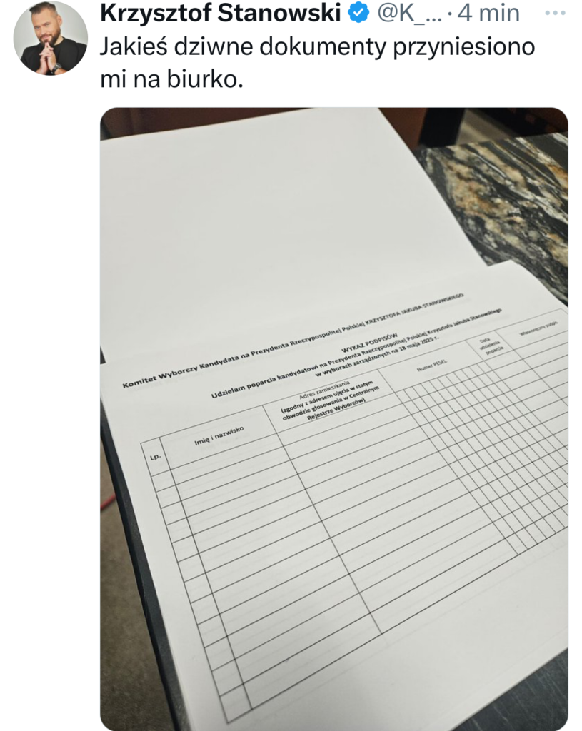 Rozpoczynając w połowie lutego zbieranie podpisów pod swoją kandydaturą Krzysztof STANOWSKI powinien bez większych problemów zebrać 100.000 podpisów poparcia przed 4 kwietnia 2025 r.