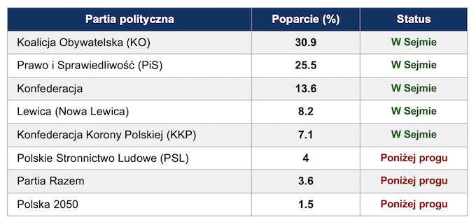Uwaga: PSL i Polska 2050 współtworząc komitet wyborczy Trzecia Droga (łącznie 5.5%) nie przekroczyłyby progu 8% dla koalicji, ale mogłyby wejść do Sejmu jako zwykły komitet wyborczy.