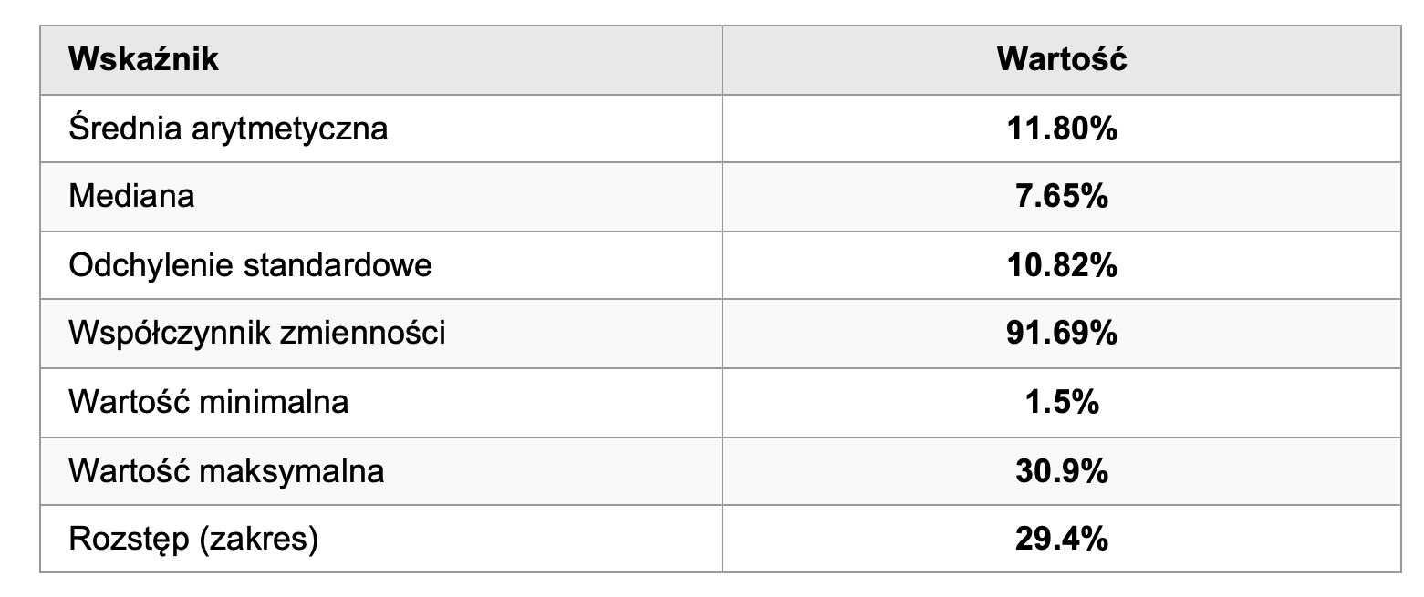 Wysoki współczynnik zmienności (91.69%) wskazuje na znaczne zróżnicowanie poparcia między poszczególnymi partiami. Różnica między najsilniejszym ugrupowaniem (KO – 30.9%) a najsłabszym (Polska 2050 – 1.5%) wynosi 29.4 punktu procentowego.