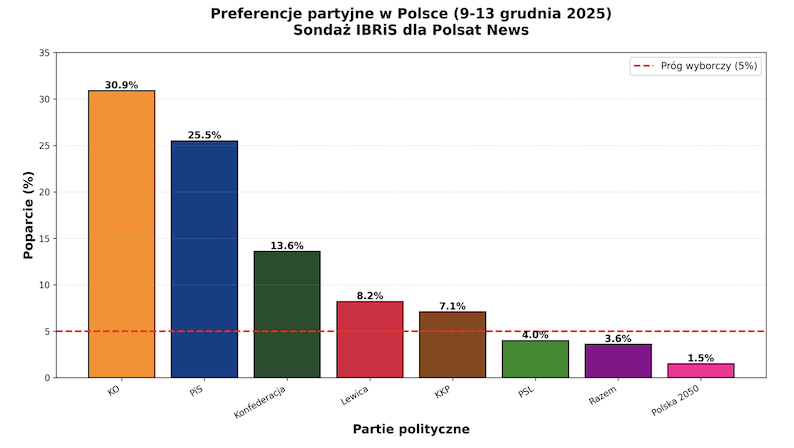 Analiza preferencji partyjnych w Polsce w okresie 9-13 grudnia 2025 roku ujawnia kilka kluczowych tendencji: