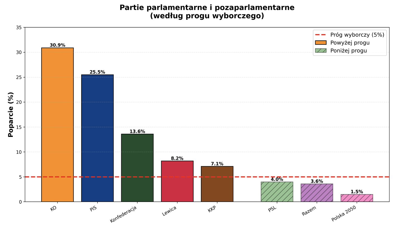 - Koalicja rządząca: KO + Lewica = 39.1% (może wymagać dodatkowego partnera dla stabilnej większości)