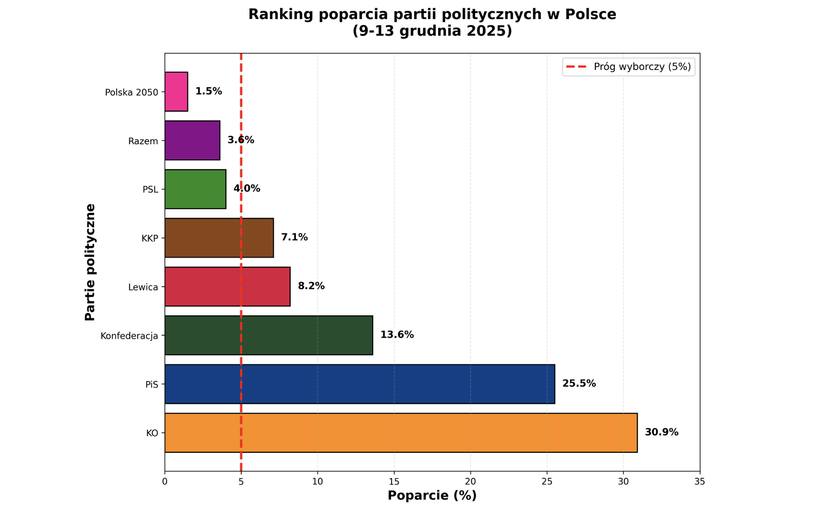 Wykres przedstawia hierarchię poparcia dla wszystkich badanych ugrupowań. Czerwona linia przerywana oznacza próg wyborczy (5%), stanowiący kluczowe kryterium wejścia do Sejmu.