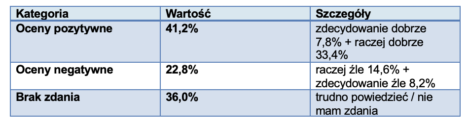 - Wyraźna przewaga ocen pozytywnych nad negatywnymi (różnica 18,4 p.p.)