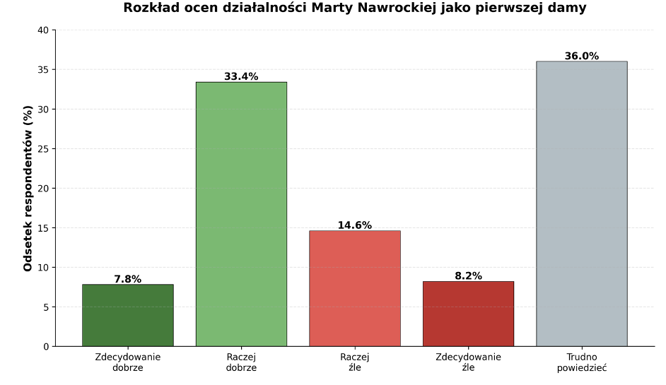 - Łączne oceny pozytywne Marty Nawrockiej (41,2%) przekraczają znacznie oceny negatywne (22,8%)
