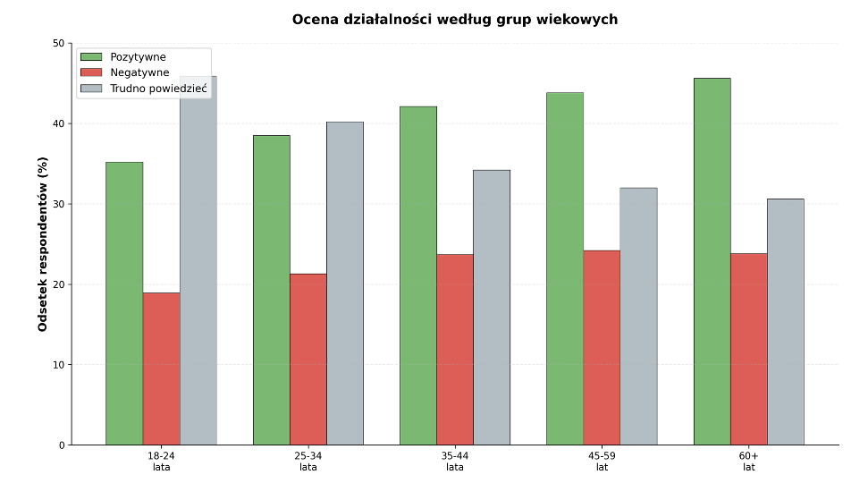 - Wyraźny trend wzrostowy ocen pozytywnych wraz z wiekiem (od 35,2% w grupie 18-24 do 45,6% w grupie 60+)