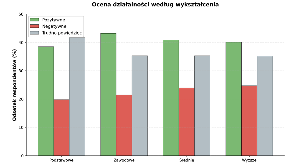- Osoby z wykształceniem zawodowym najczęściej oceniają pozytywnie (43,2%)