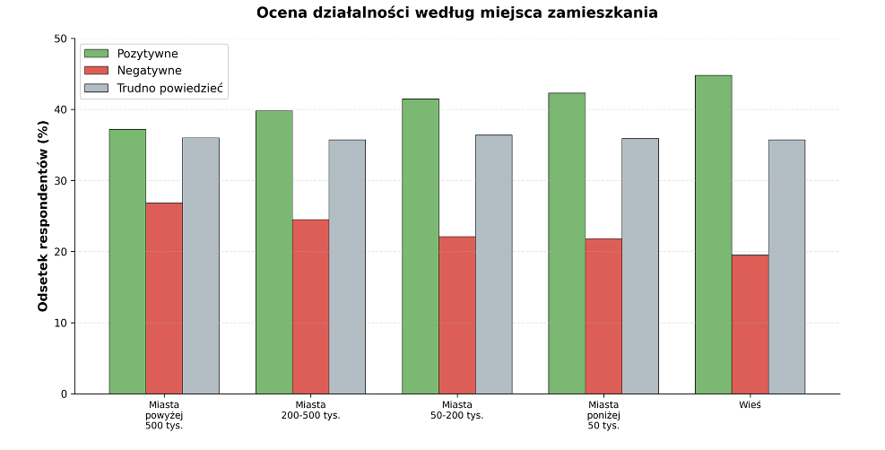 - Wieś najbardziej przychylna: 44,8% pozytywnych vs 19,5% negatywnych (różnica 25,3 p.p.)