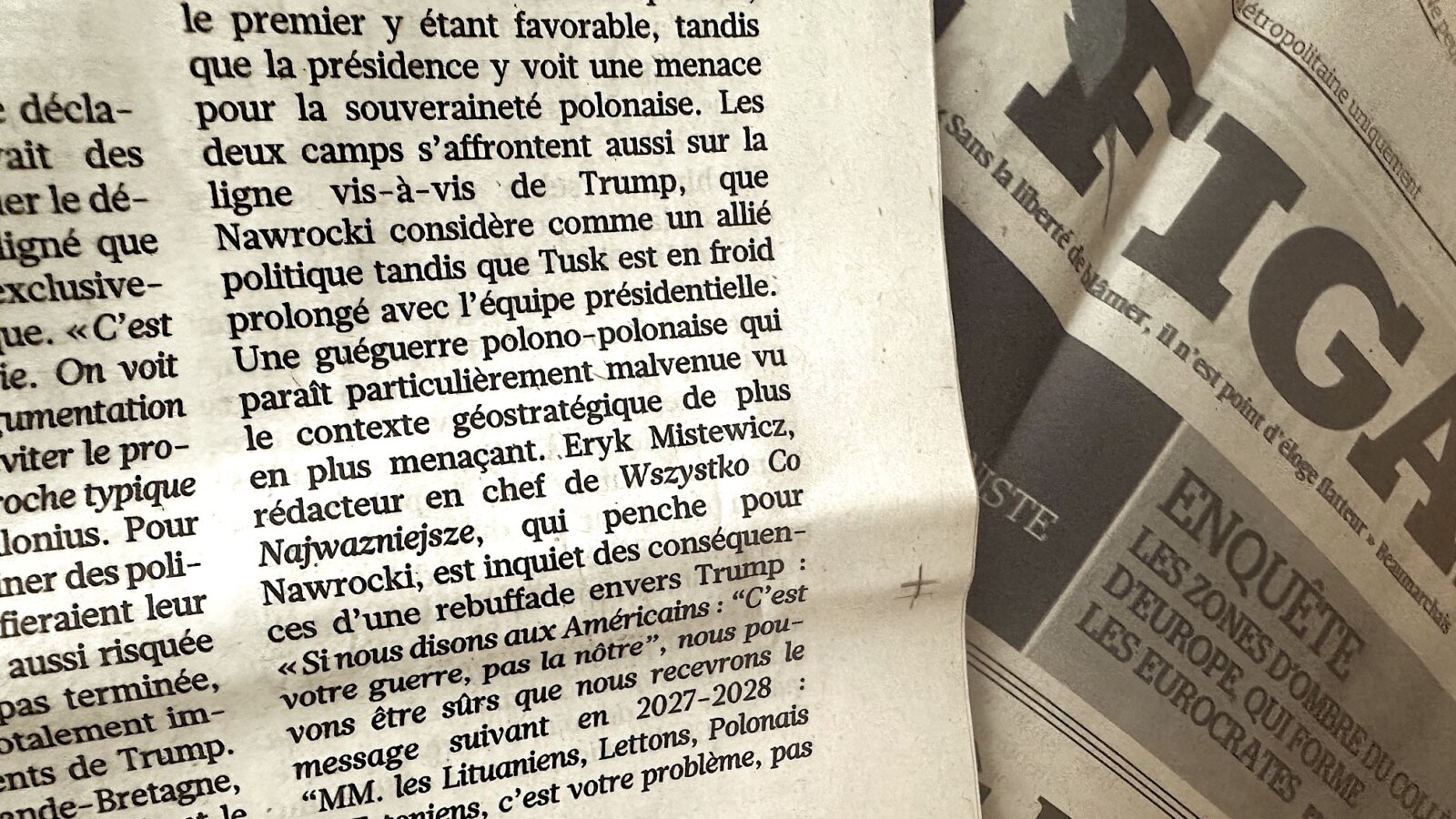 „Oba obozy spierają się również o stanowisko wobec Donalda Trumpa, którego prezydent Karol Nawrocki uważa za sojusznika politycznego, podczas gdy Donald Tusk od dawna ma napięte relacje. Ten wewnętrzny spór w Polsce wydaje się szczególnie niepożądany w obliczu coraz groźniejszego kontekstu geostrategicznego”, dodaje dziennikarka „Le Figaro”. Cytuje Eryka Mistewicza, który podkreśla, że należy dbać o sojusz amerykański: „Jeśli powiemy Amerykanom: »To wasza wojna, nie nasza«, możemy być pewni, że w latach 2027–2028 otrzymamy następujący komunikat: »Drodzy Litwini, Łotysze, Polacy czy Estończycy, to wasz problem, nie nasz«”.