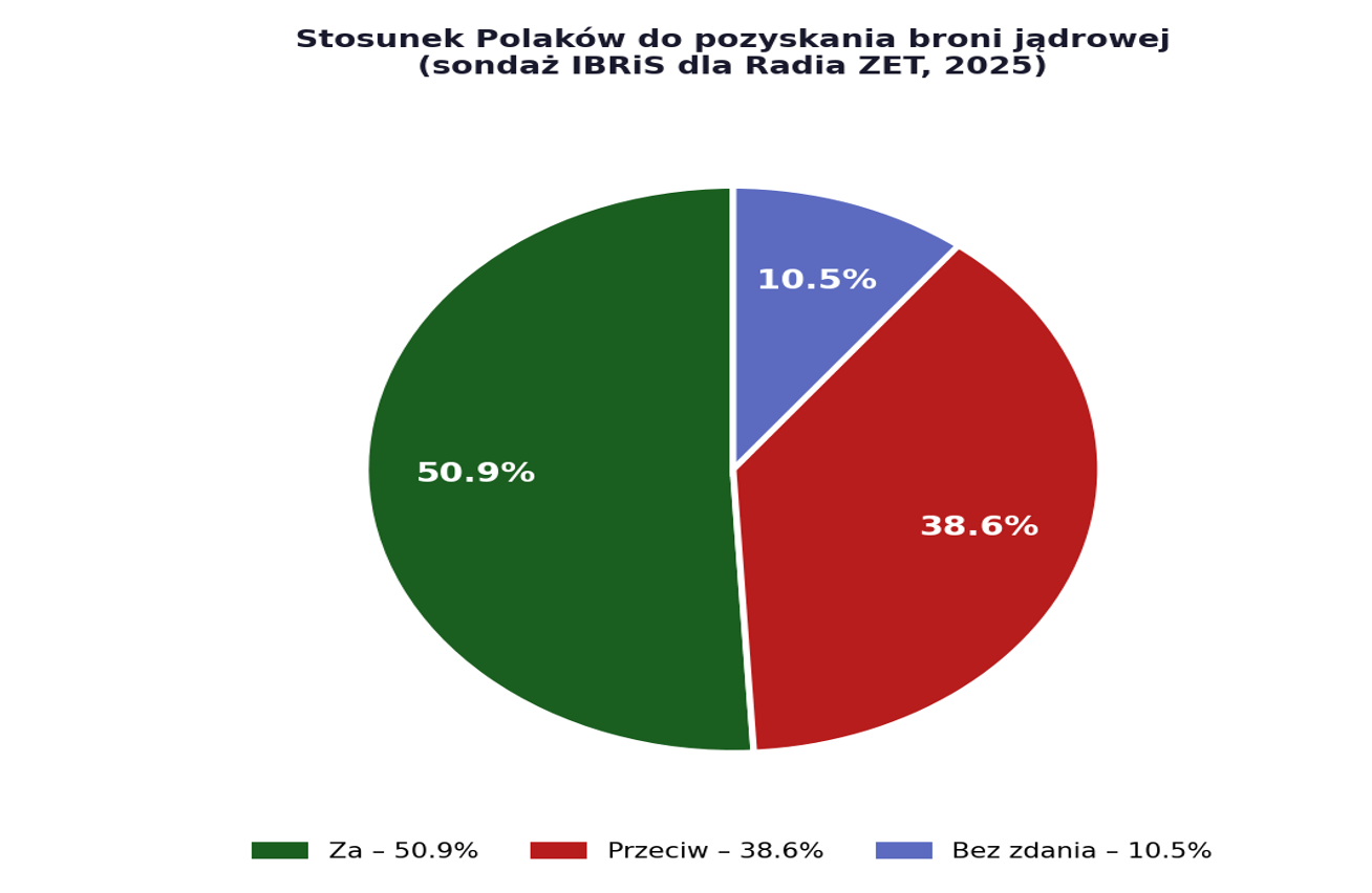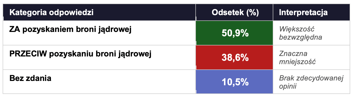 Uzyskane wyniki wskazują na wyraźną, choć niejednoznaczną tendencję w polskiej opinii publicznej. Zwolennicy pozyskania broni jądrowej stanowią większość bezwzględną (ponad 50%), co w kategoriach statystycznych oznacza dominację tej opcji nad sumą pozostałych postaw.