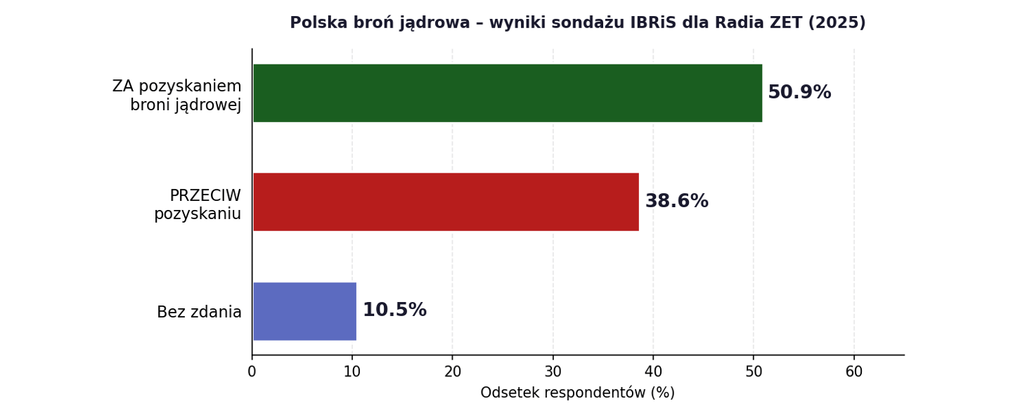 Sondaż przeprowadzony przez IBRiS na zlecenie Radia ZET dotyczył kwestii ewentualnego pozyskania przez Polskę broni jądrowej. Wyniki wskazują, że dyskusja o opcji nuklearnej posiada istotne oparcie w społeczeństwie i nie może być traktowana jako marginalna. Co sądzą Polacy o polskiej broni jądrowej?