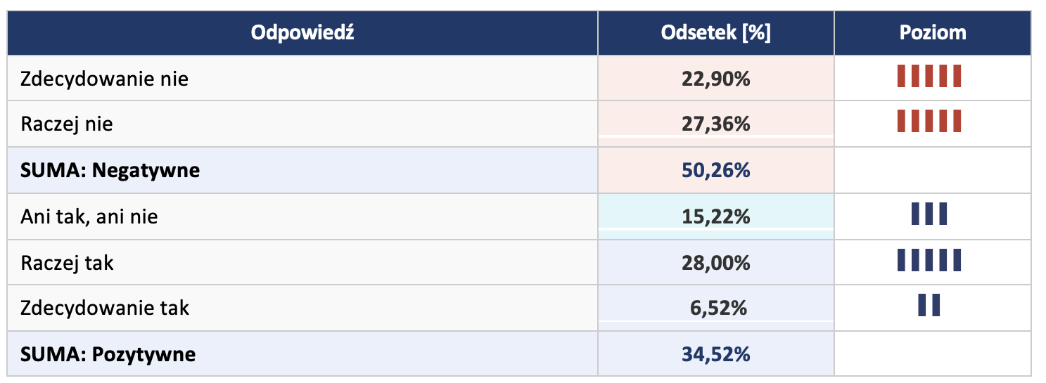 - Oceny pozytywne (suma): 34,52% – co trzeci respondent ocenia kierunek pozytywnie.