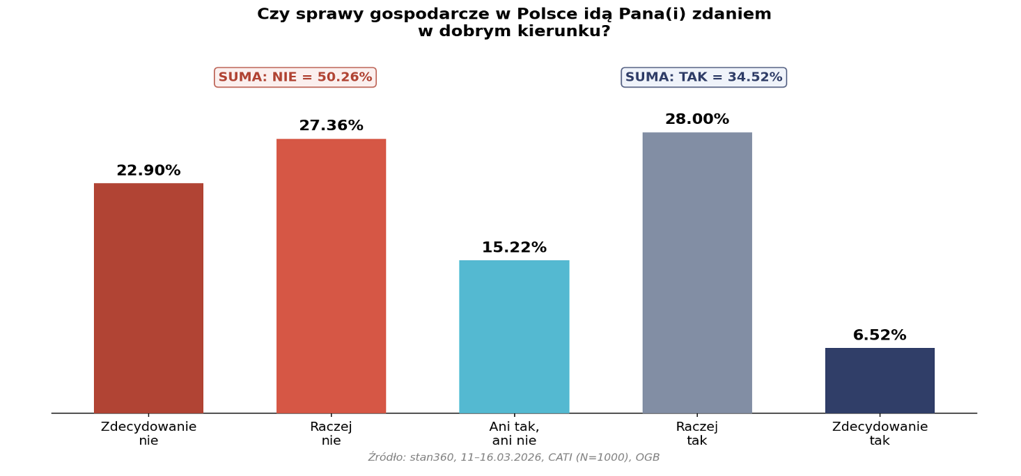 Wyniki wskazują na dominujący pesymizm Polaków w ocenie sytuacji gospodarczej. Niemal co czwarty respondent zdecydowanie negatywnie ocenia kierunek spraw gospodarczych (22,90%), a łączny odsetek ocen negatywnych przekracza 50%. Jedynie 6,52% wyraziło zdecydowanie pozytywną opinię. Dane z marca 2026 r. mogą odzwierciedlać m.in. obawy związane z rosnącym deficytem fiskalnym, presją inflacyjną oraz niepewnością geopolityczną.