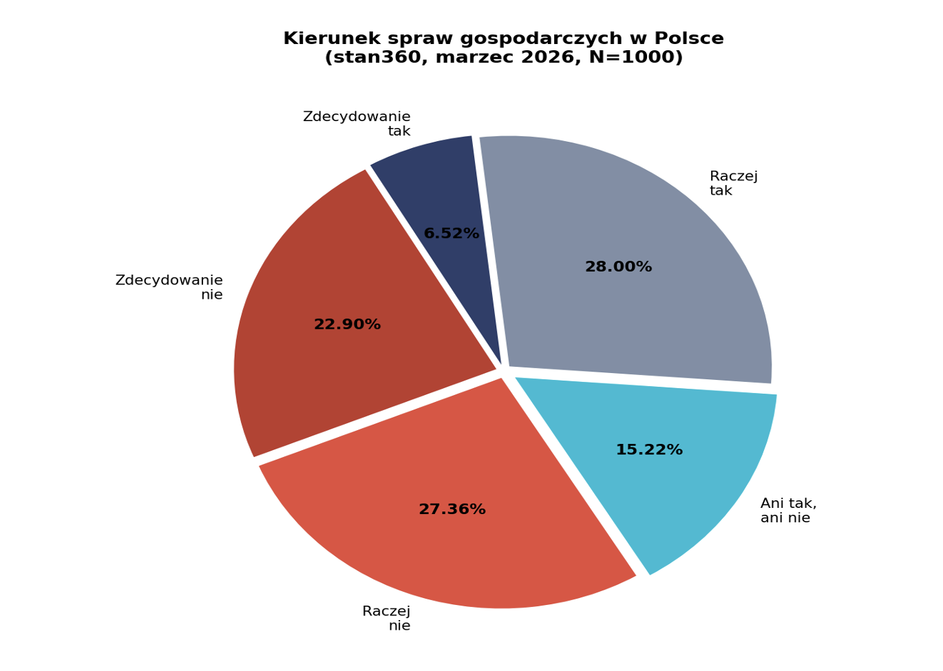 Sondaż przeprowadzony przez stan360 w dniach 11–16 marca 2026 r. na reprezentatywnej próbie N=1000 respondentów metodą CATI pokazuje wyraźną przewagę ocen negatywnych nad pozytywnymi w ocenie kierunku spraw gospodarczych w Polsce.
