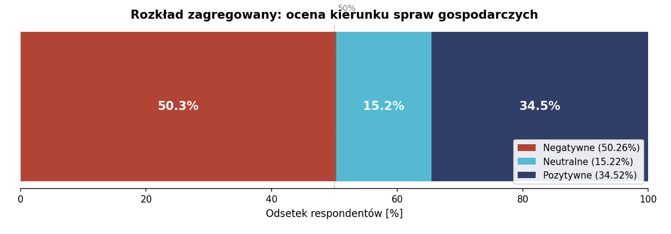 - Oceny negatywne (suma): 50,26% – połowa badanych uważa, że sprawy gospodarcze idą w złym kierunku.