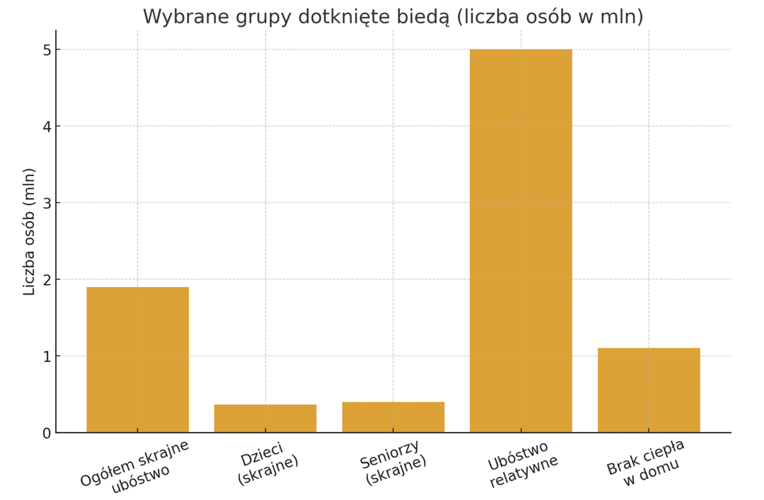 Powyższy wykres przedstawia skalę zjawiska w wybranych kategoriach. I tak w skrajnym ubóstwie żyje w Polsce ok. 1,9–2,0 mln osób, w tym 364 tys. dzieci i ponad 400 tys. seniorów. Blisko 5 mln osób znajduje się w ubóstwie relatywnym, a 1,1 mln nie stać na odpowiednie ogrzanie mieszkania. Oznacza to, że polska bieda ma bardzo konkretny, materialny wymiar: ograniczony dostęp do ciepła, edukacji, wypoczynku oraz usług zdrowotnych.