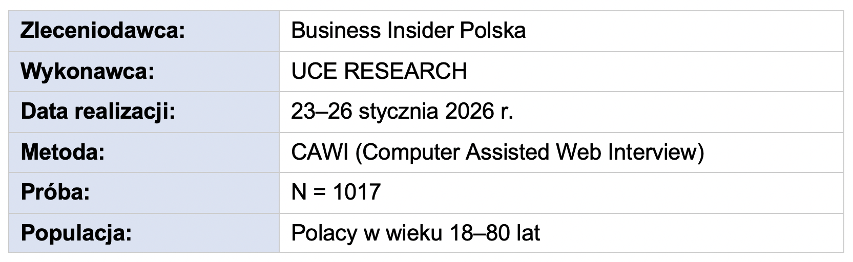 Badanie zostało przeprowadzone przez UCE RESEARCH na zlecenie Business Insider Polska w styczniu 2026 r. metodą CAWI (Computer Assisted Web Interview). Próba badawcza obejmowała 1017 respondentów 18+.