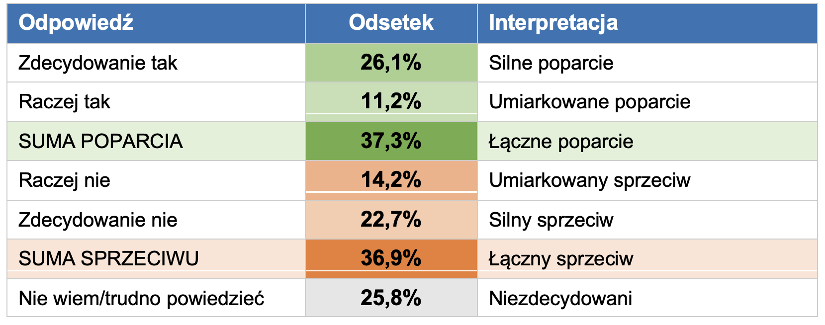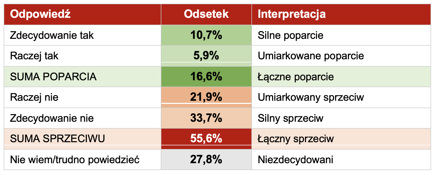 Charakterystyczne jest, że silne poparcie przewyższa silny sprzeciw o 3,4 p.p., ale jednocześnie umiarkowany sprzeciw przewyższa umiarkowane poparcie 3,0 p.p. Ta struktura wskazuje na polaryzację opinii z jednoczesną niepewnością środka elektoratu.
