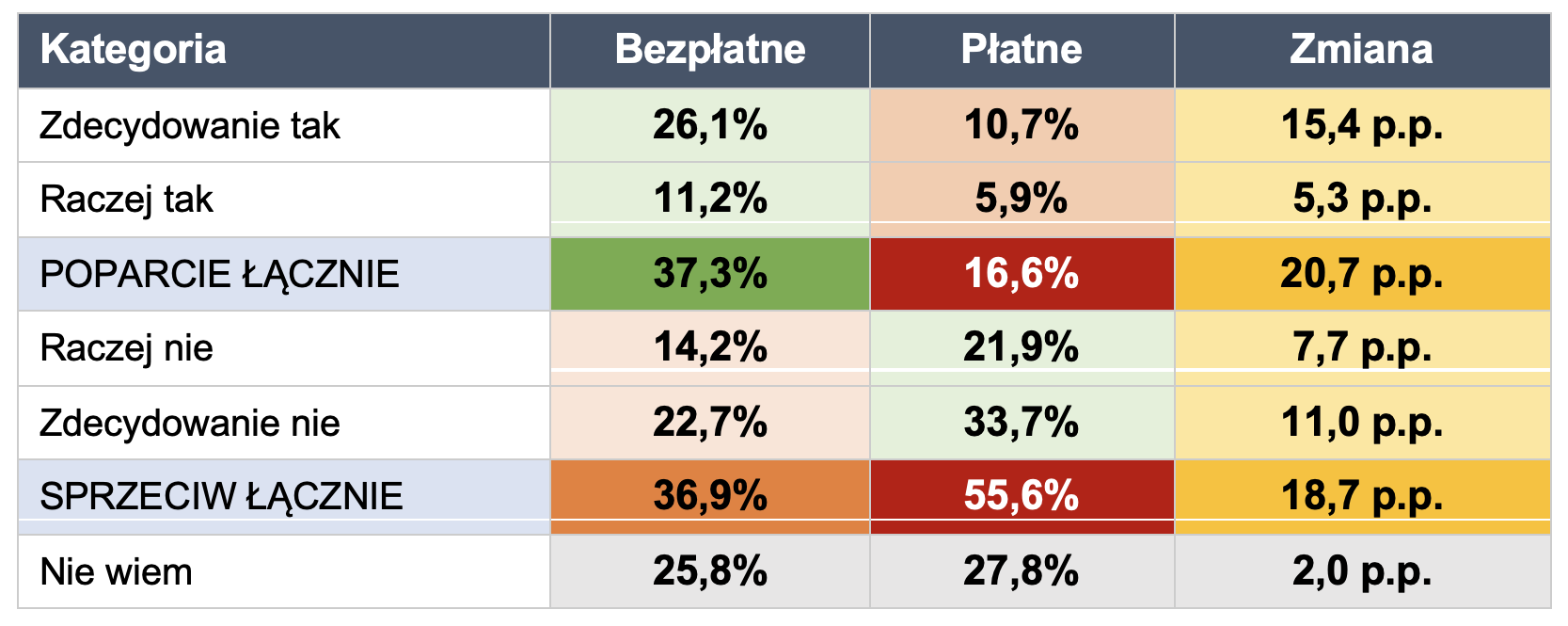 • Wzrost sprzeciwu o 18,7 punktu procentowego przy konieczności płacenia