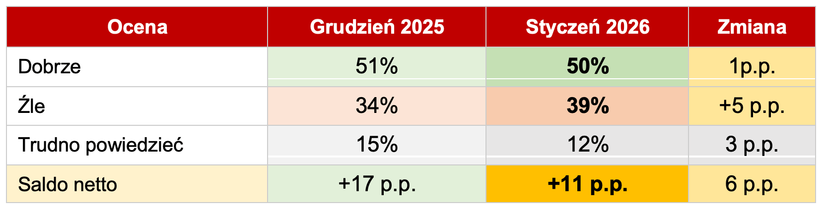 • Spadek ocen pozytywnych o 1 punkt procentowy (z 51% do 50%)