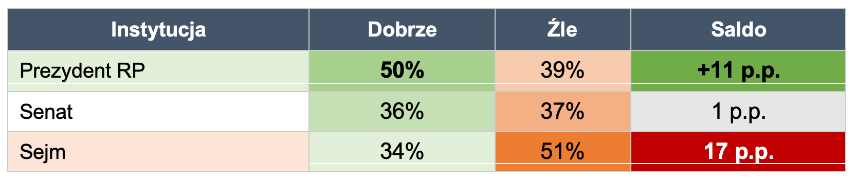 1. Prezydent (saldo +11 p.p.): Urząd prezydenta cieszy się najwyższym poziomem aprobaty społecznej. Połowa Polaków pozytywnie ocenia działalność Karola Nawrockiego, co plasuje go wyraźnie powyżej obu izb parlamentu.