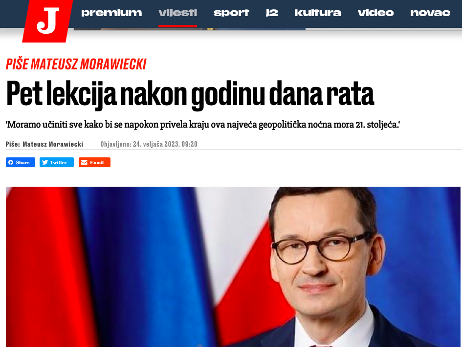 Tekst premiera Mateusza Morawieckiego pt. „Pięć lekcji po roku wojny”, który ukazał się na łamach „Wszystko Co Najważniejsze”, został opublikowany również w Chorwacji przez „Jutarnji list”. Artykuł premiera Morawieckiego w „Jutarnji list“ stanowi część projektu „Opowiadamy Polskę Światu”, którego realizatorem jest Instytut Nowych Mediów. Najnowsza, dwudziesta odsłona projektu, realizowana jest w rocznicę napaści rosyjskiej na Ukrainę (24 lutego).