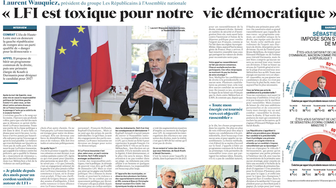 Laurent Wauquiez jest przewodniczącym deputowanych Republikanów w Zgromadzeniu Narodowym. W rozmowie z tygodnikiem „Journal du Dimanche” ostro występuje przeciw skrajnie lewicowemu ugrupowaniu Jean-Luc Melenchona: „LFI jest trucizną dla naszego życia demokratycznego”. Żąda aby izolować to ugrupowanie. Apeluje też do centroprawicy o wybór jednego kandydata w wyborach prezydenckich 2027.