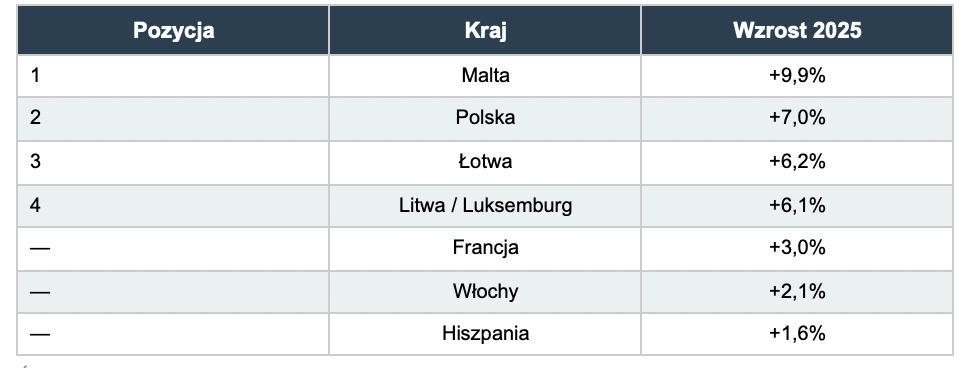 Polska odnotowała drugi najszybszy wzrost turystyki w Unii Europejskiej w 2025 roku, zaraz po Malcie. Według Eurostat, liczba noclegów w obiektach turystycznych wzrosła o 7% w porównaniu z rokiem poprzednim, wyprzedzając tradycyjne potęgi turystyczne jak Francja (+3%), Włochy (+2,1%) i Hiszpania (+1,6%).