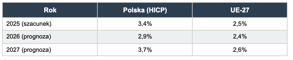 Inflacja w Polsce ma wykazywać tendencję spadkową w 2026 roku, osiągając prognozowany poziom 2,9%, zbliżając się do celu inflacyjnego NBP. Jest to spadek z szacowanego poziomu 3,4% w 2025 roku. Prognoza zakłada dalszy wzrost do 3,7% w 2027 roku, głównie z powodu wejścia w życie systemu ETS2 (jeśli nie zostanie opóźniony), który zwiększy ceny energii.