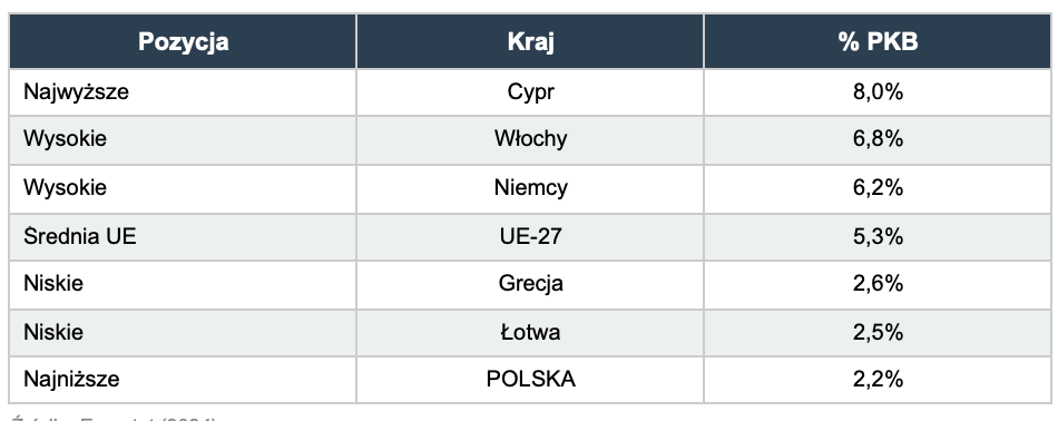 Polska znajduje się na ostatnim miejscu w Unii Europejskiej pod względem inwestycji w mieszkalnictwo jako procent PKB. W 2024 roku inwestycje te wyniosły zaledwie 2,2% PKB, znacznie poniżej średniej unijnej wynoszącej 5,3%.