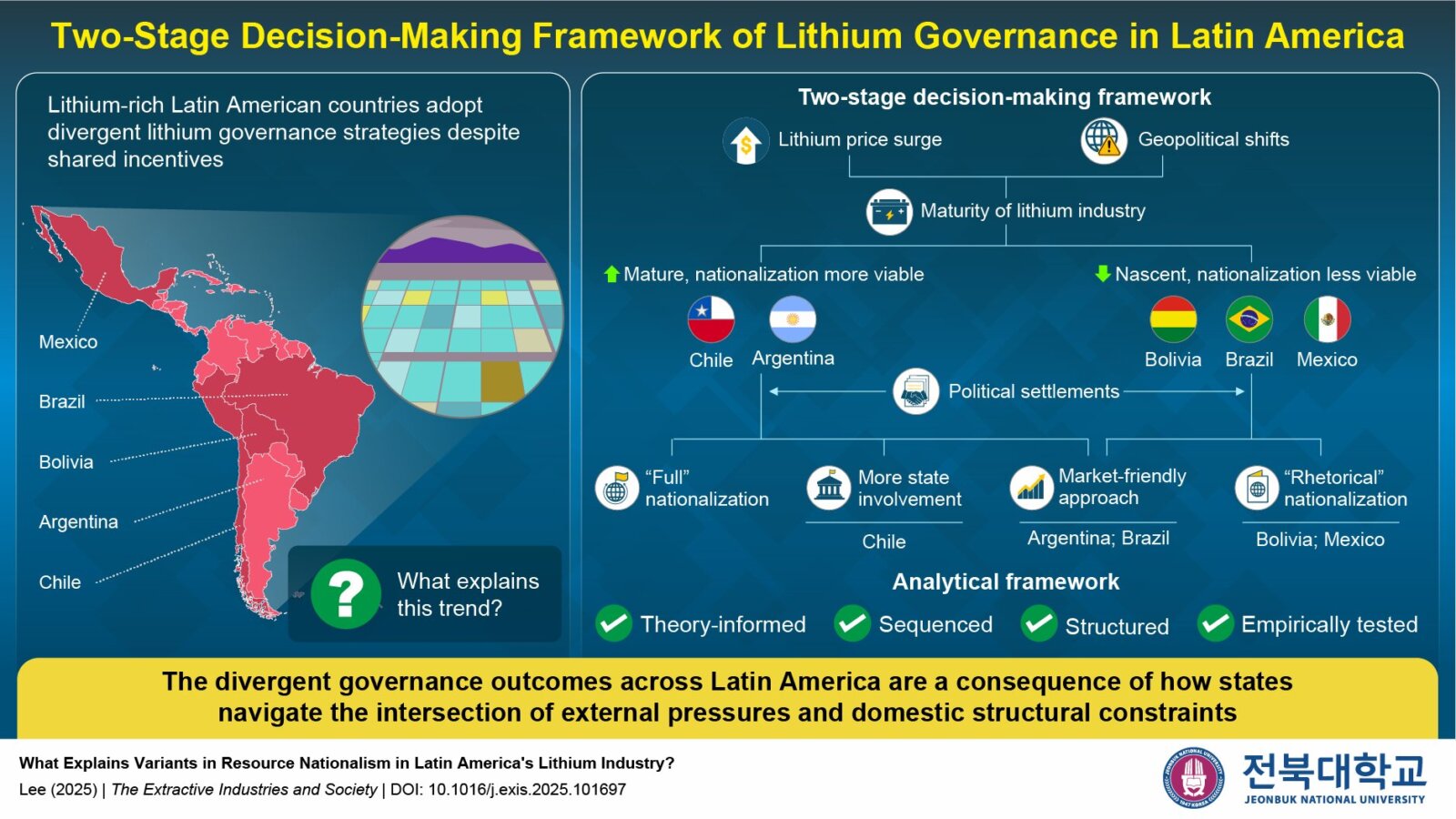 Zróżnicowanie tych strategii stało się przedmiotem analizy w badaniach nad zarządzaniem litem w Ameryce Łacińskiej. Dwustopniowe ramy decyzyjne zaproponowane przez Seungho Lee wskazują, że kluczową rolę odgrywają dwa poziomy czynników. Na pierwszym etapie państwa reagują na presję zewnętrzną, taką jak globalne cykle cen surowców czy konkurencja strategiczna między mocarstwami. Reakcja jest jednak filtrowana przez stopień dojrzałości krajowego sektora litowego, obejmujący infrastrukturę, know-how i doświadczenie instytucjonalne. Na drugim etapie decydujące znaczenie mają wewnętrzne układy polityczne, które określają, jak daleko państwo jest gotowe posunąć się w bezpośredniej interwencji.