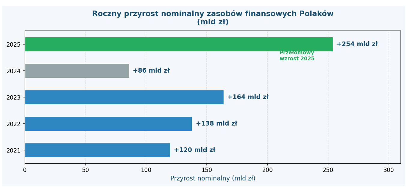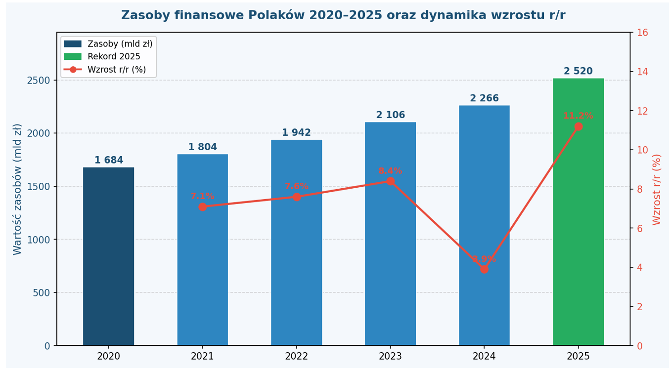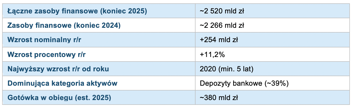 Na koniec 2025 roku łączne zasoby finansowe Polaków, a więc zasoby polskich gospodarstw domowych osiągnęły rekordowy poziom ~2 520 mld zł, odnotowując wzrost o 11,2% rok do roku. Jest to najwyższe tempo wzrostu od co najmniej pięciu lat, znacznie przekraczające wyniki z lat poprzednich.