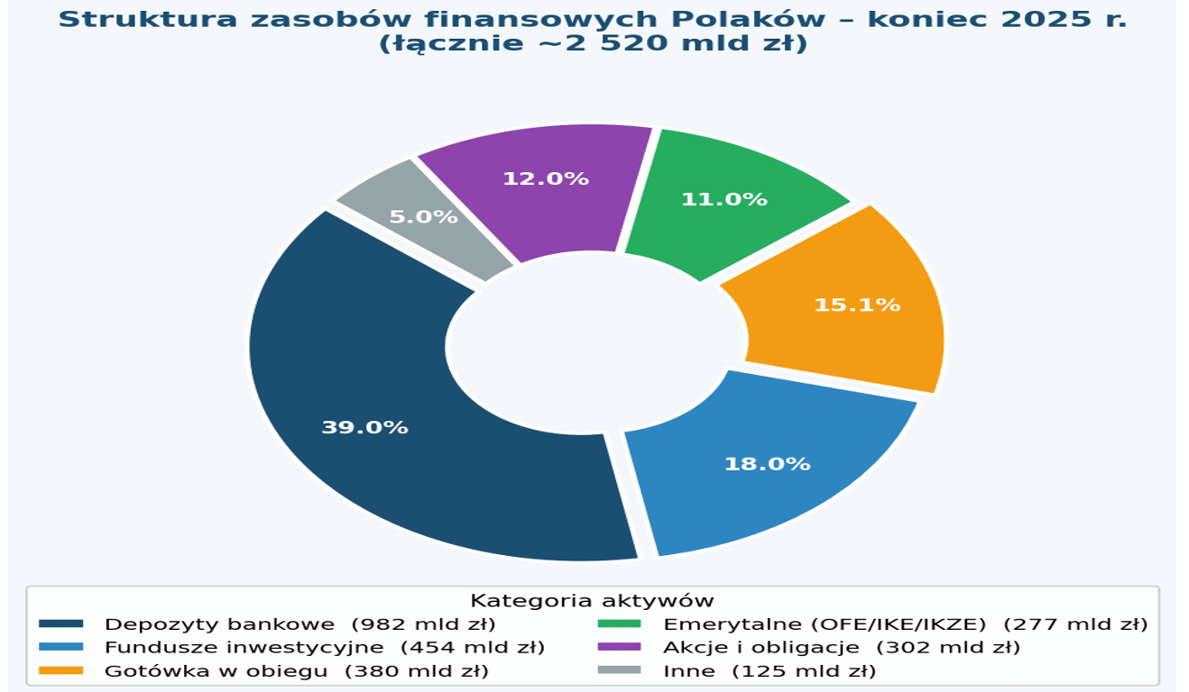 Na szczególną uwagę zasługuje pozycja gotówki w obiegu (~15% całości, tj. ok. 380 mld zł), która stanowi rosnącą, choć paradoksalną odpowiedź na cyfryzację systemu płatniczego. Produkty emerytalne i oszczędnościowe (OFE, IKE, IKZE) oscylują wokół 11% portfela – jest to wciąż niski wskaźnik względem krajów starej Unii Europejskiej, wskazujący na lukę w długoterminowym planowaniu finansowym Polaków.