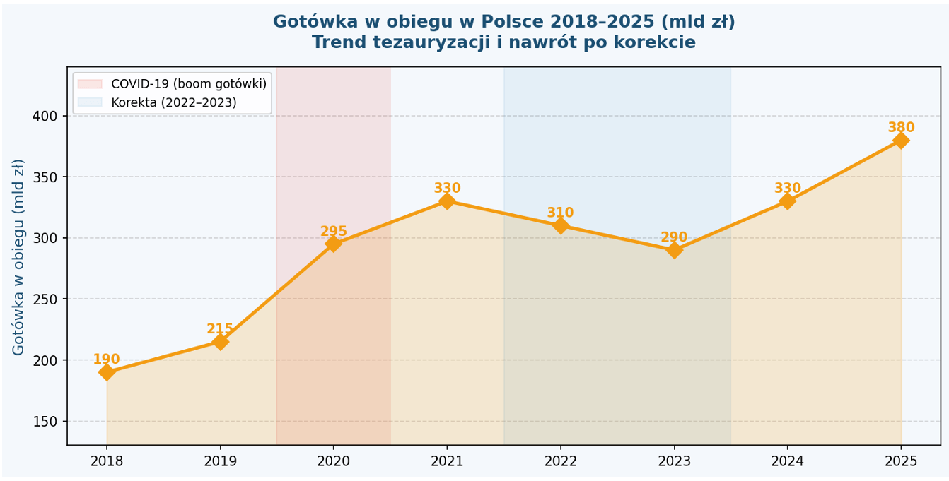 Pandemiczny skok z 2020 roku (+80 mld zł w ciągu roku) stał się punktem wyjścia dla nowego, wyższego poziomu bazowego gotówki w obiegu. Po korekcie w latach 2022–2023 (wynikającej m.in. z wysokiej inflacji i preferencji dla oprocentowanych lokat), trend powrócił z nową siłą. Czynniki strukturalne tego zjawiska obejmują: