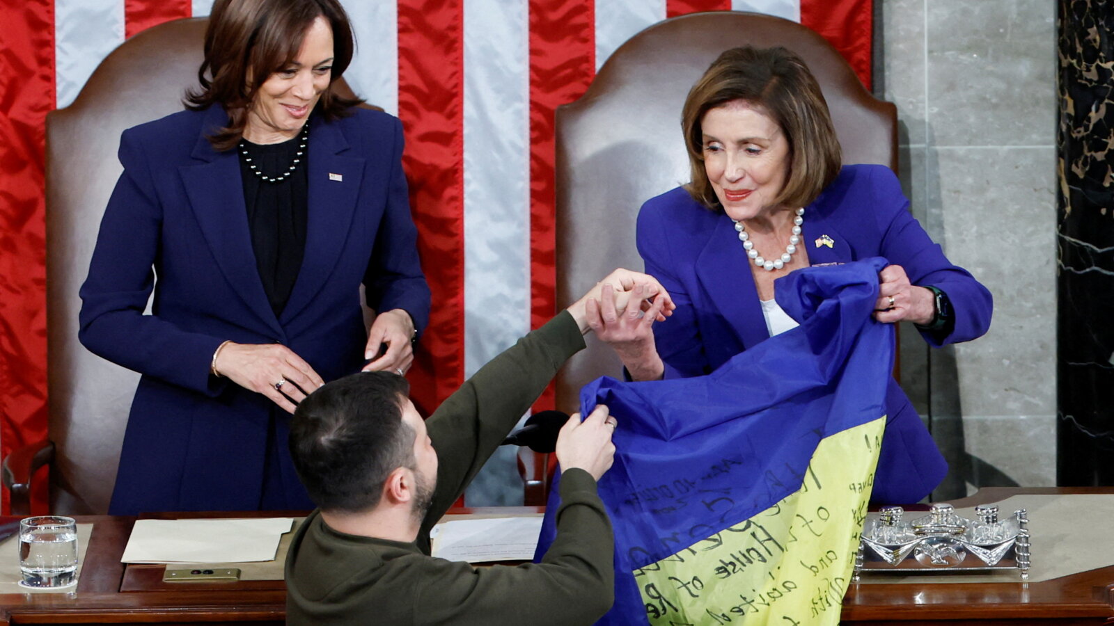 .Na zakończenie swojego wystąpienia Zełenski wręczył spikerce Izby Reprezentantów Nancy Pelosi i wiceprezydent Kamali Harris ukraińską flagę przywiezioną z Bachmutu i podpisaną przez walczących tam ukraińskich żołnierzy. W zamian otrzymał flagę USA, która wisiała tego dnia nad Kapitolem.
