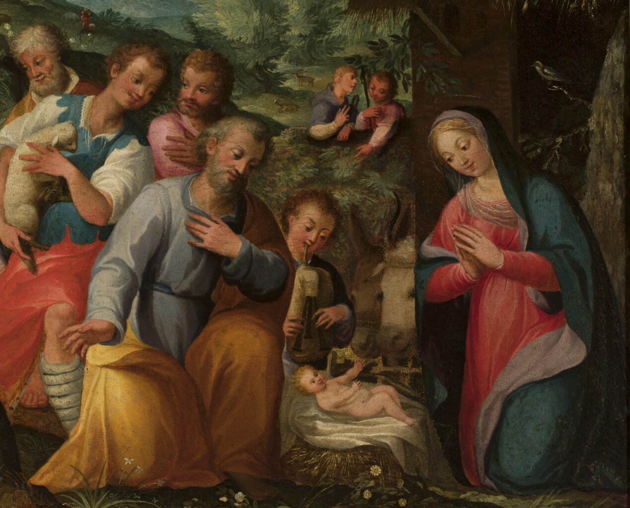 .Jak wiadomo z Ewangelii Łukasza (rozdz. 2), to pasterze jako pierwsi przybyli do groty czy stajenki betlejemskiej powiadomieni przez anioła. „A to będzie znakiem dla was – czytamy w tej Ewangelii – Znajdziecie Niemowlę, owinięte w pieluszki i leżące w żłobie. I nagle przyłączyło się do anioła mnóstwo zastępów niebieskich, które wielbiły Boga słowami: »Chwała Bogu na wysokościach…«”. To te lakoniczne słowa stały się inspiracją dla licznych malarzy, także dla tego, którego obraz znajduje się w zbiorach Muzeum Narodowego w Warszawie. Został namalowany w połowie XVI wieku zapewne w środkowych Włoszech. Jego pełna radosnego uniesienia kompozycja podzielona jest na sferę nieba i ziemi. W ziemskiej scenerii, na tle rozległego, pełnego soczystej zieleni pejzażu z licznymi zwierzętami, Matka Boska i św. Józef, klęcząc, składają hołd nagiemu Chrystusowi, ułożonemu na sianie przykrytym białą szatą. Tuż za Józefem ukazanych jest pięciu radosnych pasterzy, z których jeden trzyma na rękach małego baranka, a drugi, będący chłopcem kilkunastoletnim, przygrywa Dzieciątku na kobzie. Scenie adoracji przygląda się dwóch chłopców widocznych w tle. Na pierwszym planie płótna dostrzegamy kwiaty i inne rośliny, a na dachu stajenki, przed którą ma miejsce adoracja, dwa gołąbki. Tuż nad głową radosnej Matki Boskiej, ubranej w czerwoną suknię i niebieski płaszcz, dostrzegamy szczygła (symboliczne odniesienie do Pasji).