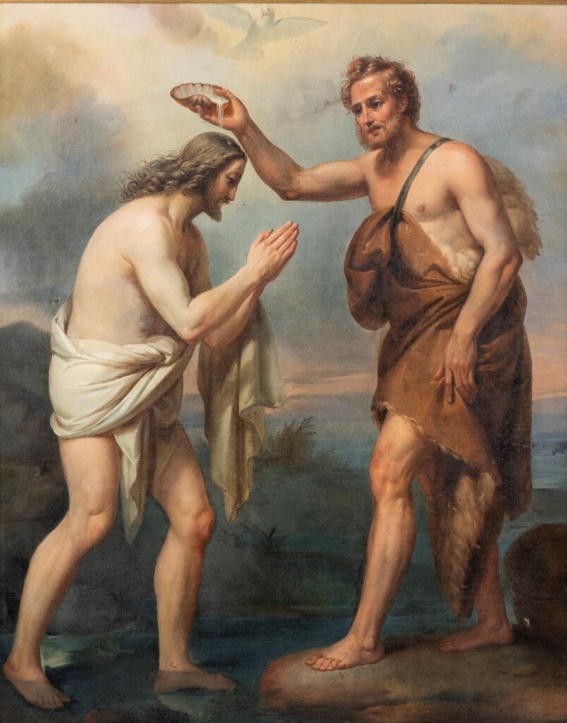Artysta ukazał tylko dwie postacie stojące w płytkiej wodzie – Chrystusa i Jana Chrzciciela – oraz unoszącą się nad nimi w blasku światła gołębicę Ducha św. Długowłosy Chrystus ze złożonymi modlitewnie rękoma pochyla głowę, na którą Jan Chrzciciel, ubrany zgodnie z tradycją w rodzaj futra, leje wodę z muszli. W tle widnieje górzysty krajobraz, delikatnie zarysowane, niewielkie drzewa i różowo-błękitne skłębione chmury. Mamy tu dokładne zobrazowanie słów Ewangelii odnoszących się do wydarzenia nad Jordanem (Łk 3,22): „Duch Święty zstąpił na Niego, w postaci cielesnej niby gołębica, a z nieba odezwał się głos: »Tyś jest mój Syn umiłowany, w Tobie mam upodobanie«.