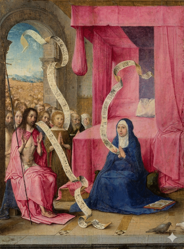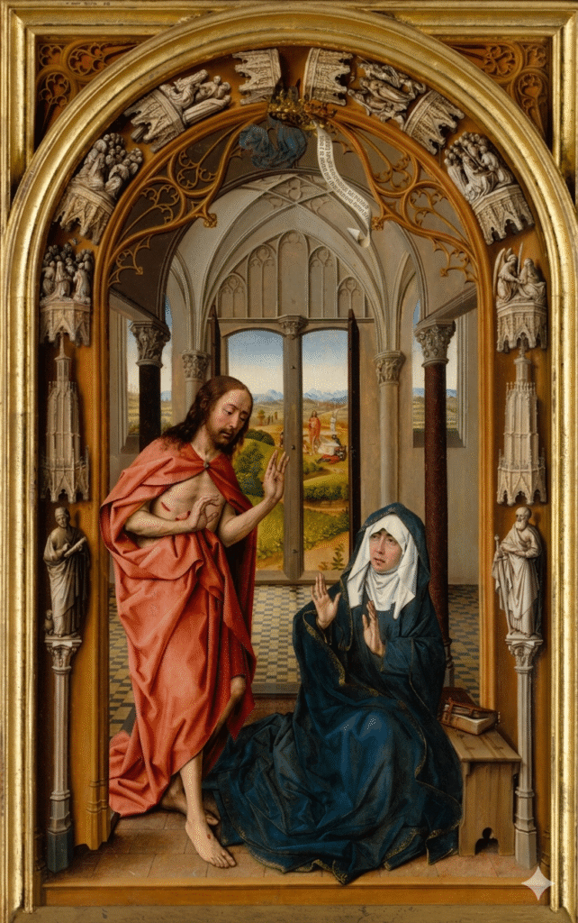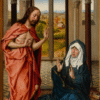 Pierwsze – z poł. XV wieku – jest dziełem Juana de Flandesa i znajduje się obecnie w Metropolitan Museum of Art w Nowym Jorku. Na progu pięknej komnaty, do której prowadzi portal ozdobiony rzeźbami o tematyce chrystologiczno-maryjnej, widzimy odzianego w czerwoną szatę Chrystusa stojącego obok siedzącej po prawej stronie w ciemnej szacie Matki Boskiej. Ich podniesienie ręce, pełne symbolicznych znaczeń, i uduchowione oblicza nadają wydarzeniu znamiona niezwykłości, stosownie do wielkości tematu i jego przesłania. Poprzez widoczne w głębi pokoju okno dostrzegamy scenę wyjścia Chrystusa z grobu.